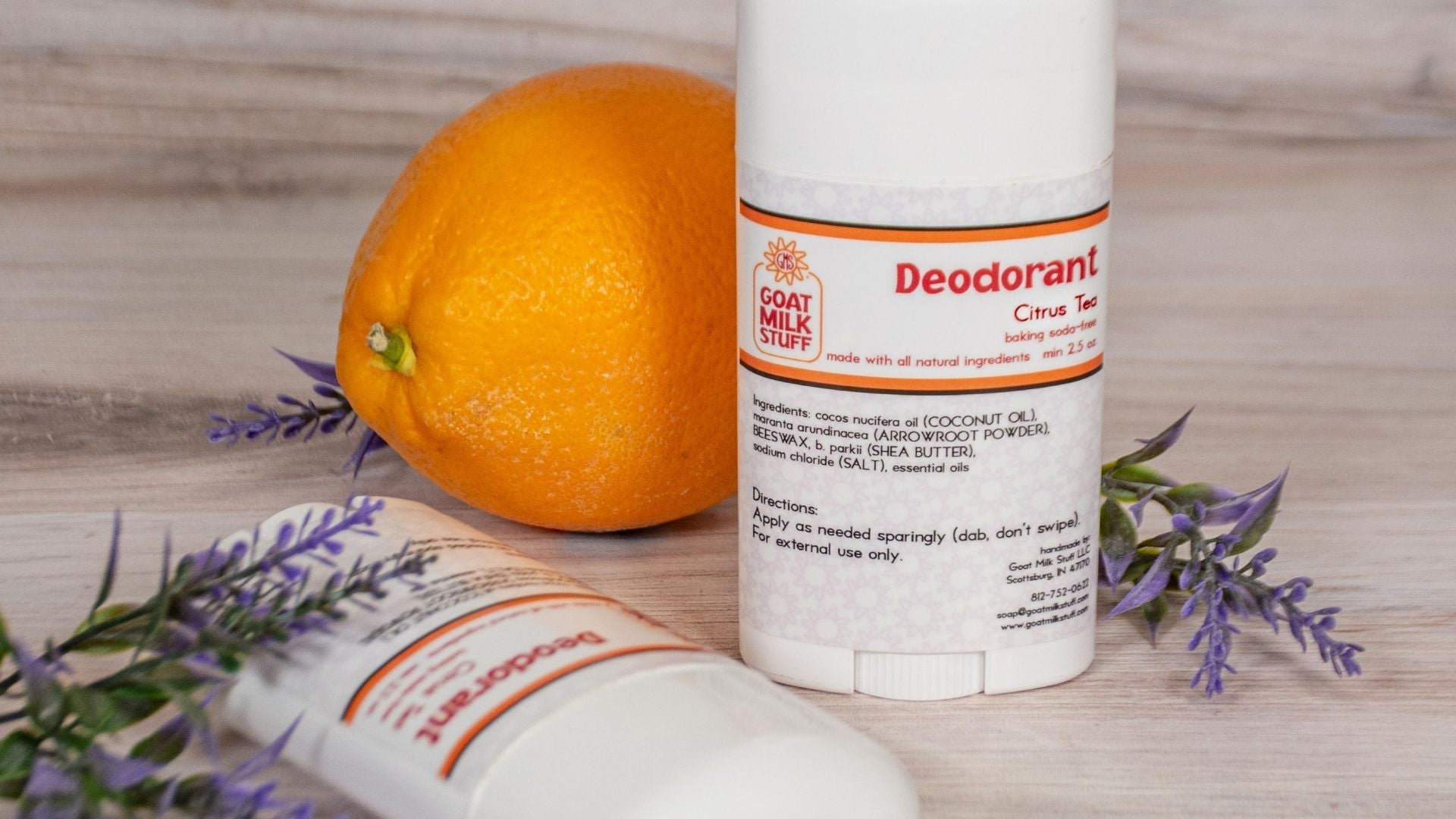 Coconut oil; Arrowroot powder; Beeswax; Shea butter; Salt; Dehydrated goat milk; Orange essential oil; Lavender essential oil; Tea Tree essential oil.